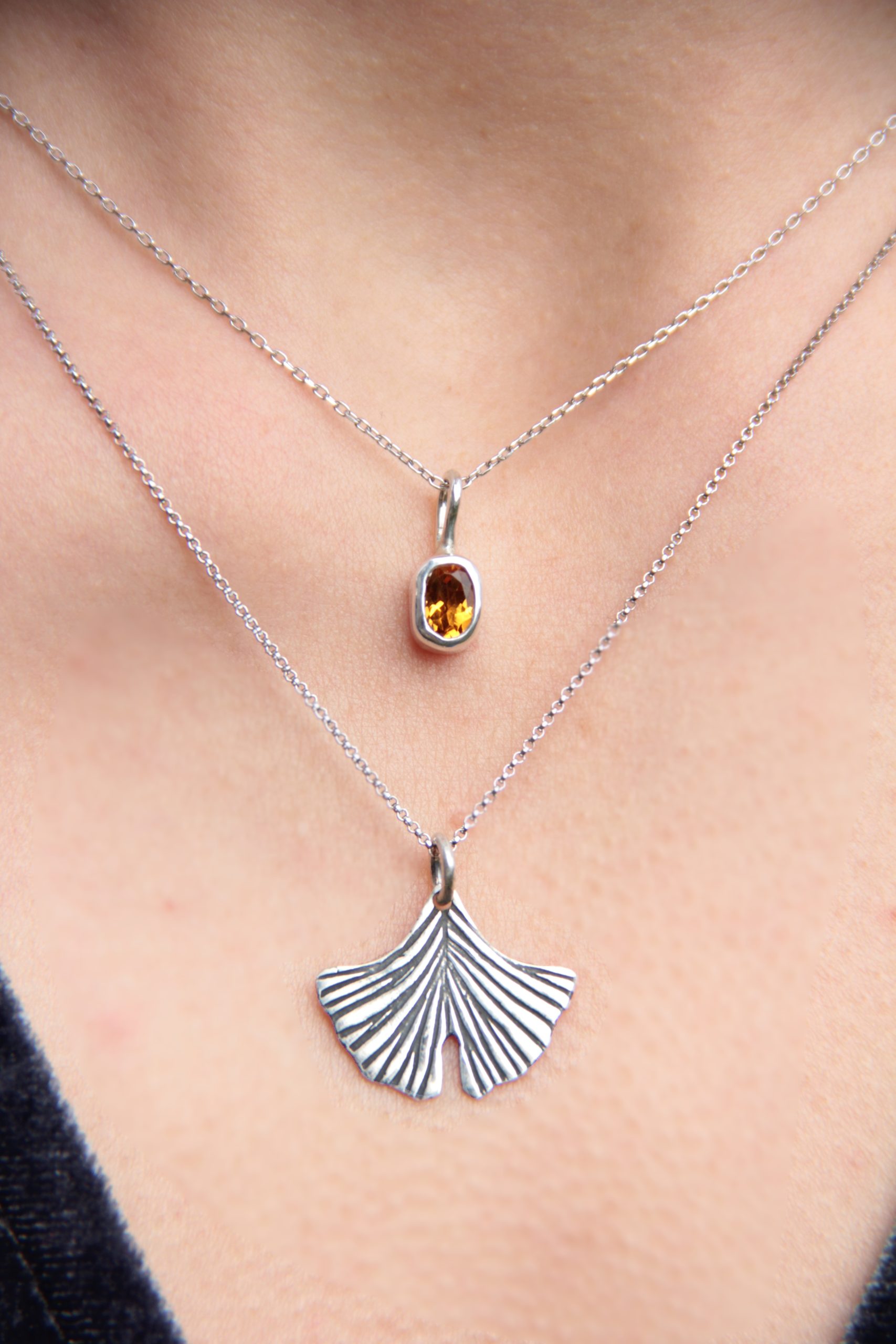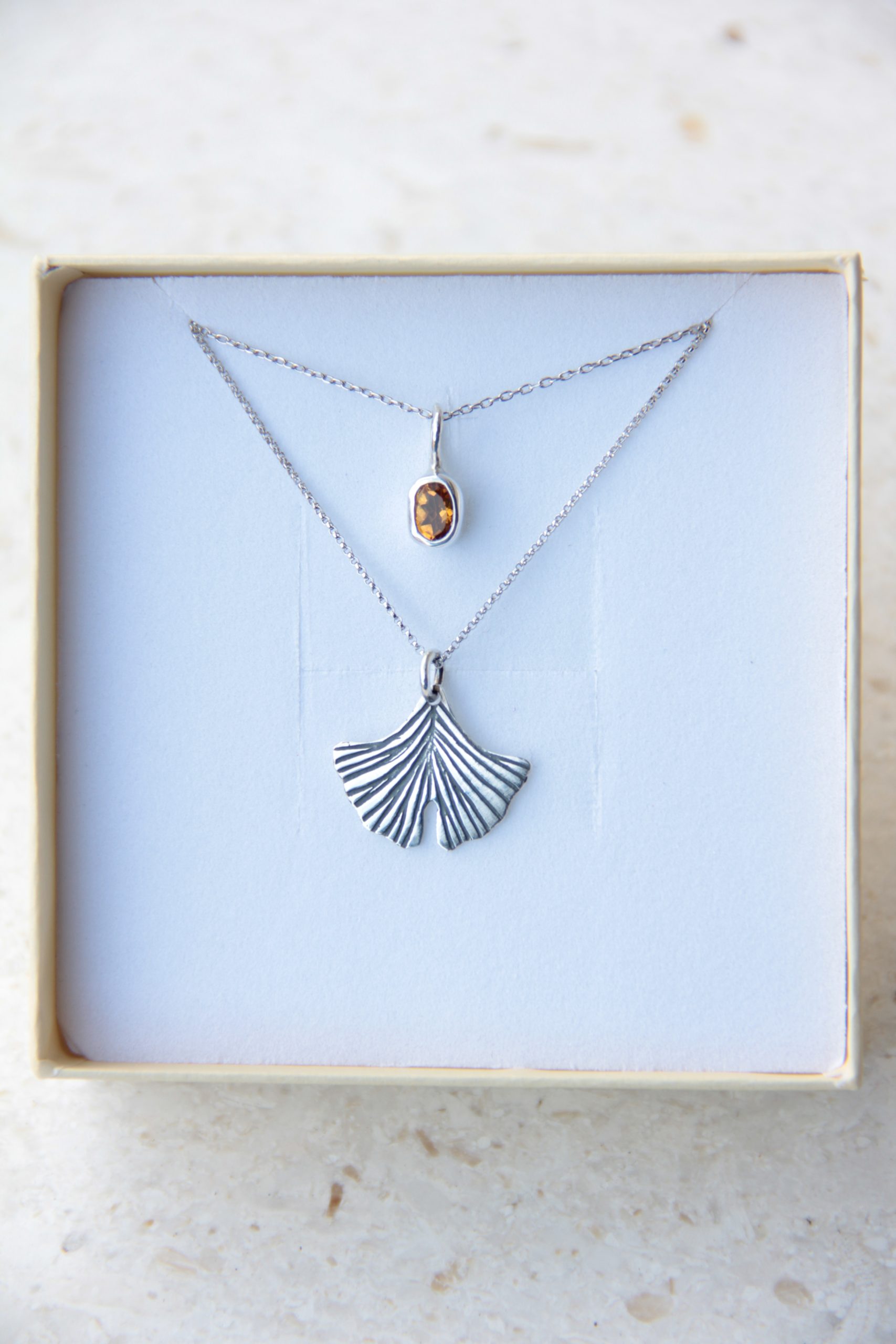 Ginko & Citrin set je ogrlica u kombinaciji poludragog kamena citrina i lista stabla Ginka. Ogrlice su odvojene i mogu se nositi odvojeno. Nakit je u potpunosti ručne izrade.