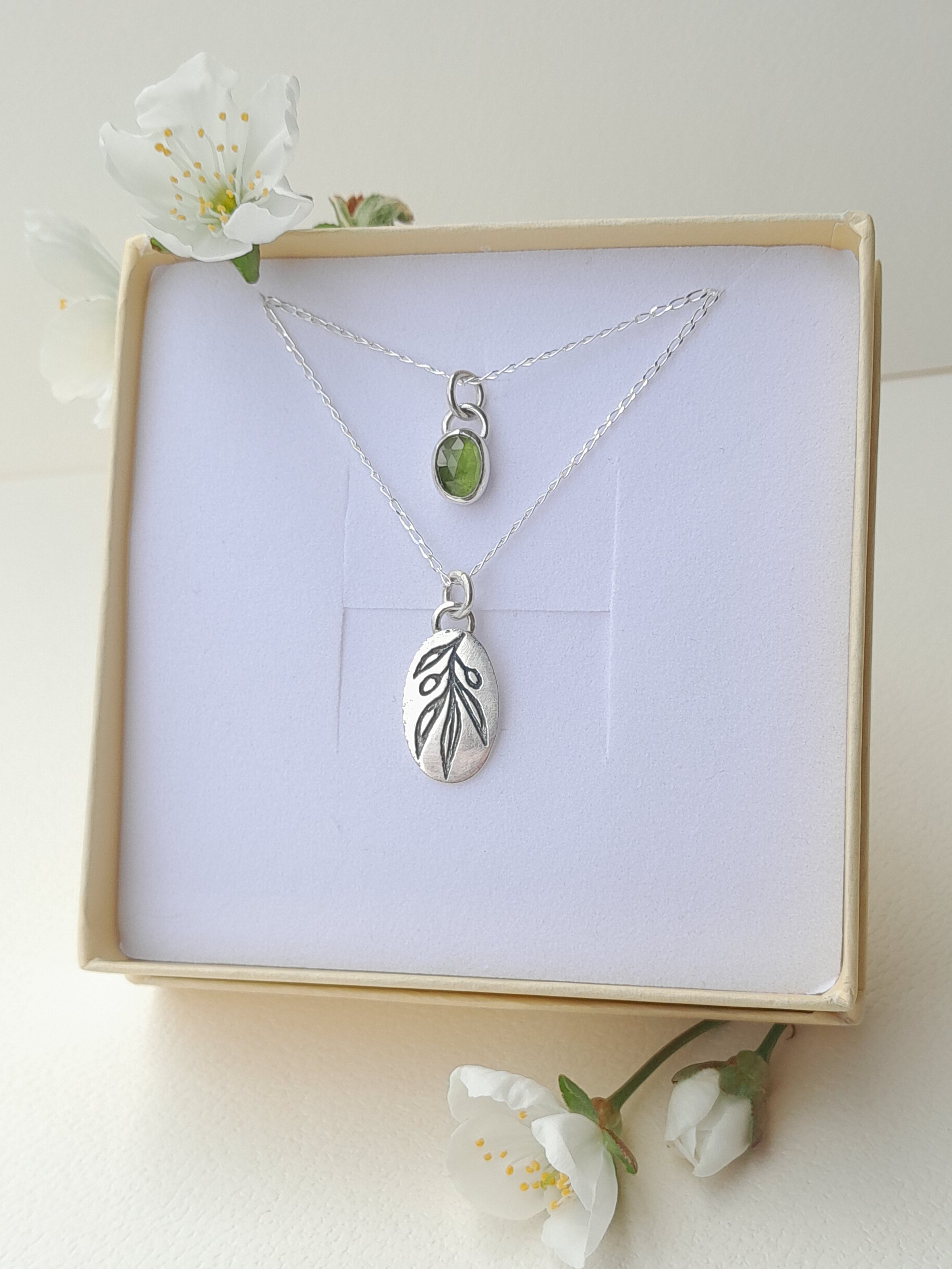 Olive & Peridot set ogrlica s ručno izrađenom gravurom grančice masline i peridot prirodnim poludragim kamenom.
