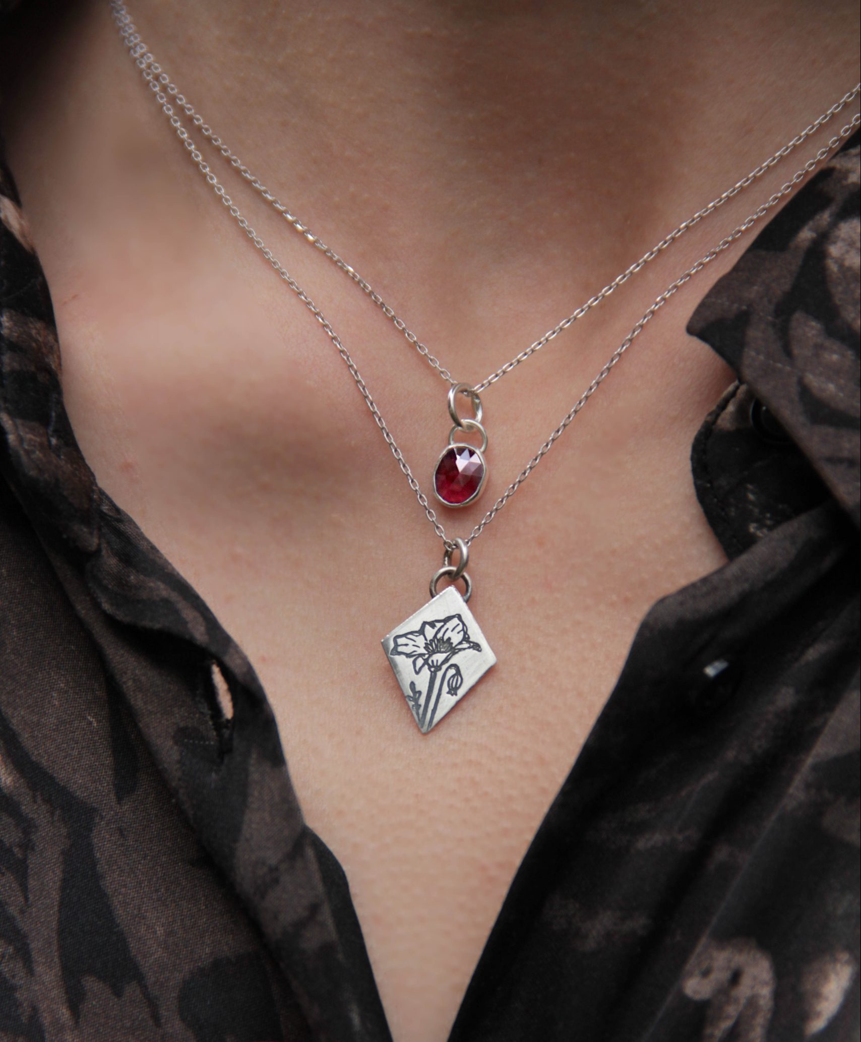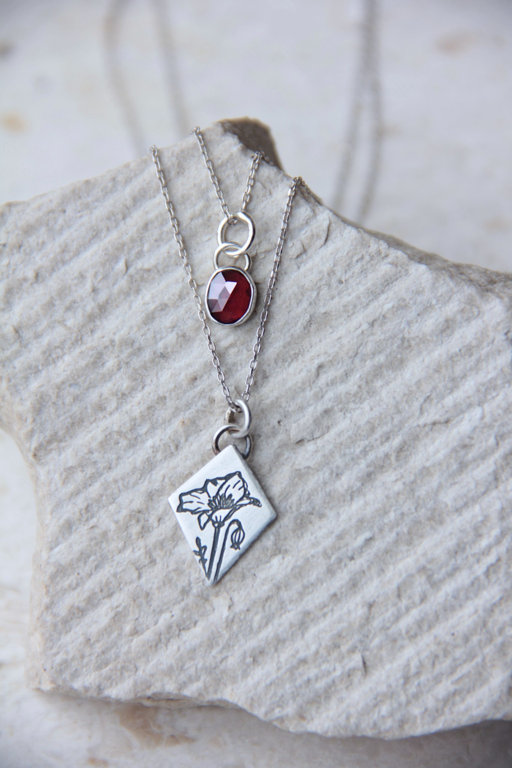 Set ogrlica s crvenim granatom i privjeskom s gravurom biljke i cvijeta maka. Obzirom da gravure nastaju ručno, moguća su minimalna odstupanja od dizajna. Zato uvijek možete biti sigurni da ćete u svojoj kolekciji imati unikate.