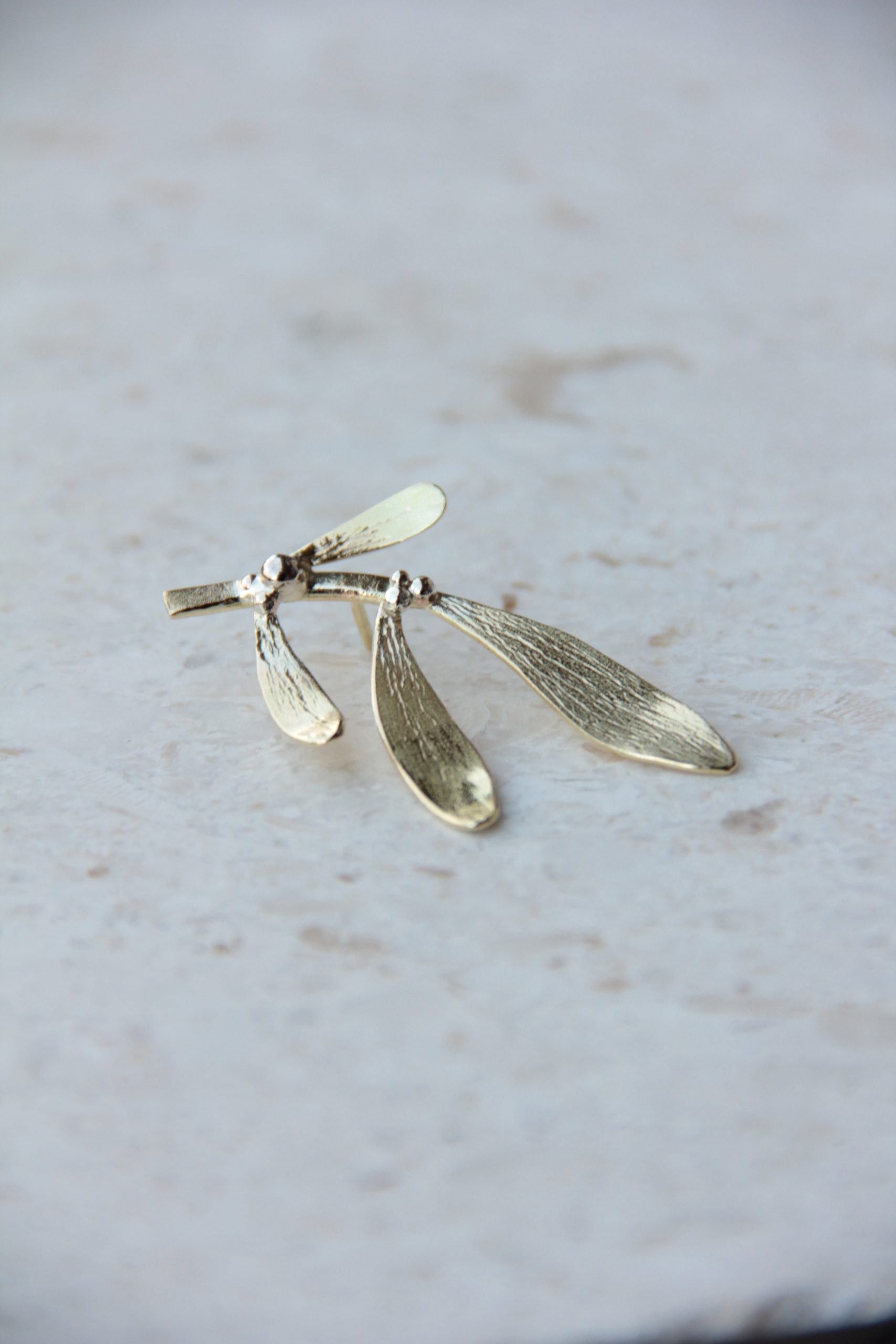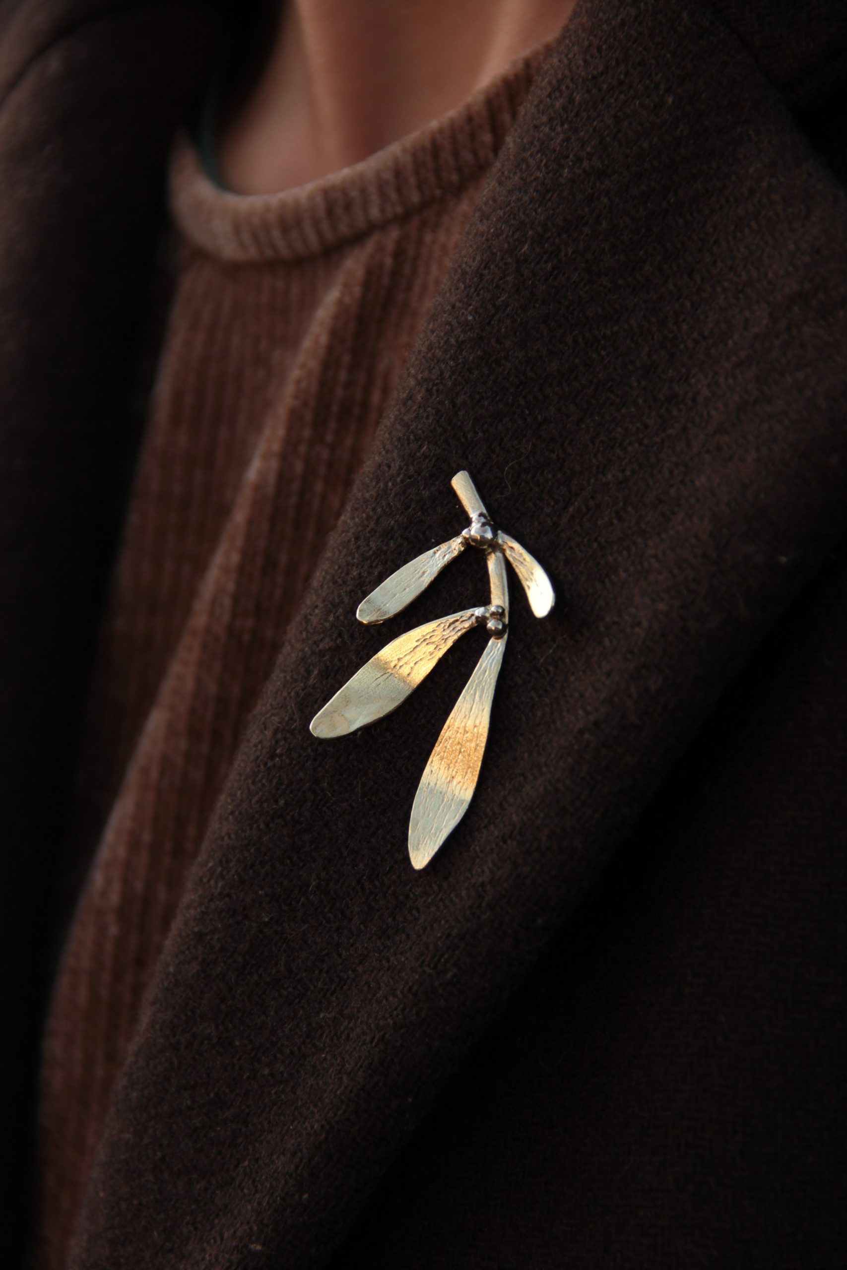 Imela broš dizajniran je posebno kao komad nakita koji će se nositi na beretki. Elegantnih linija, u kombinaciji mjedi i srebra, grančica Imele u potpunosti je ručne izrade. Sa stražnje strane broša nalazi se iglica i sigurnosni čep koji iglu fiksira i čini ju potpuno sigurnom pri nošenju. Broš ne uključuje beretku.